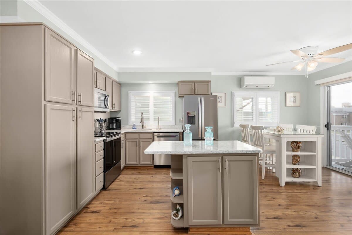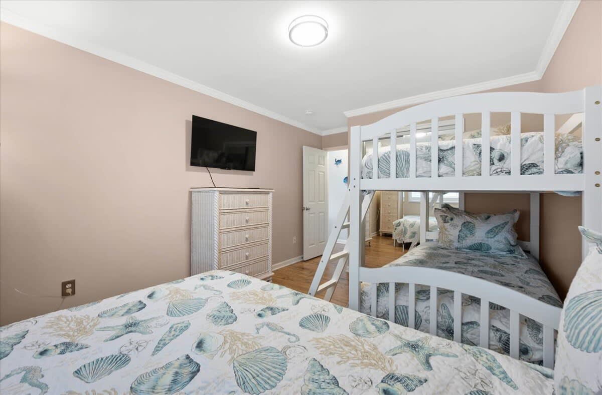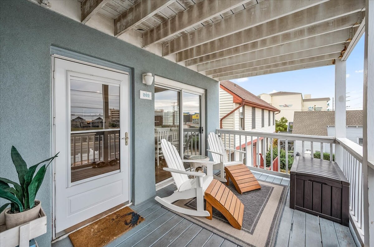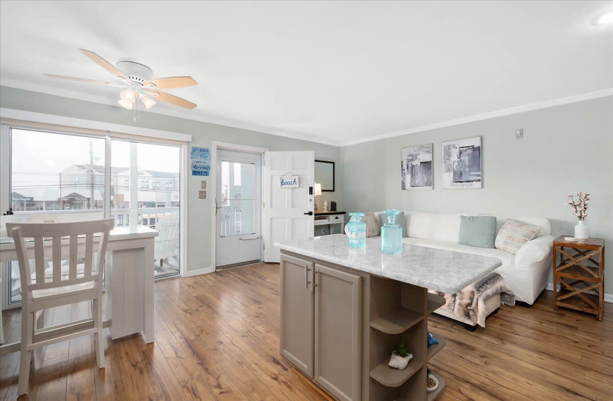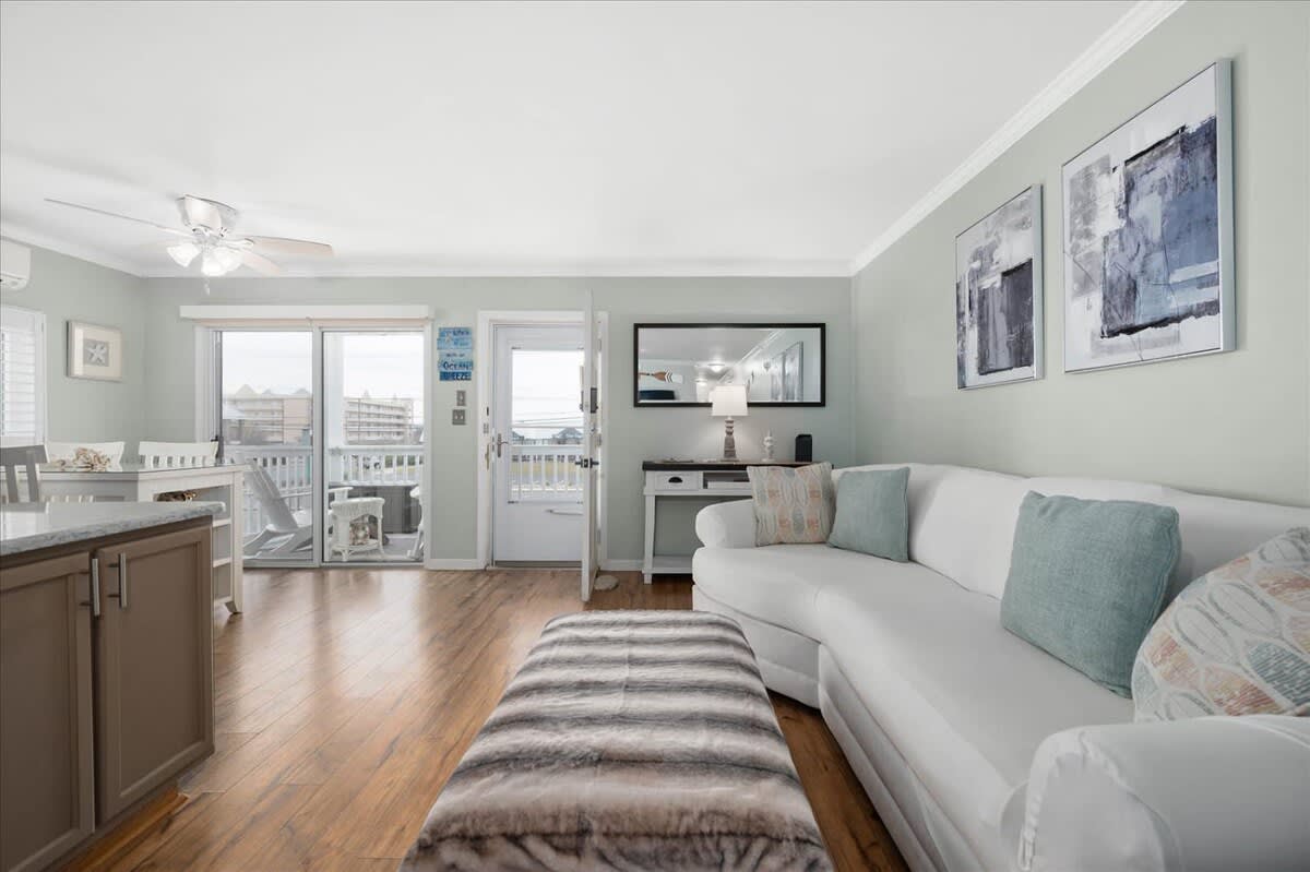 Nicely renovated two bedroom oceanside condo in laid-back North Ocean City. This condo offers two bedrooms, one full-bathroom, one half-bathroom and an open living area. The living area features a nicely decorated living room, fully-equipped kitchen and a dining area. The condo’s end-unit location lets in a lot of nice, natural light for an open feel. There is a balcony off of the living area that is a nice place to relax and unwind after a long day at the beach. The first bedroom features a king-sized bed, television and an ensuite half-bathroom. The second bedroom features a set of bunk-beds, Queen bed and a television. The full-bathroom is centrally located and easily accessible from throughout the condo. The beach, Northside Park, restaurants, amusements, shopping and more are all within a short walk. Come make some memories at the beach with Coastal Life Vacations. Linen and towel package included with reservation. Management fee includes Damage Waiver for $1000 in accidental damage coverage. License #87233 This condo is located on the second floor.